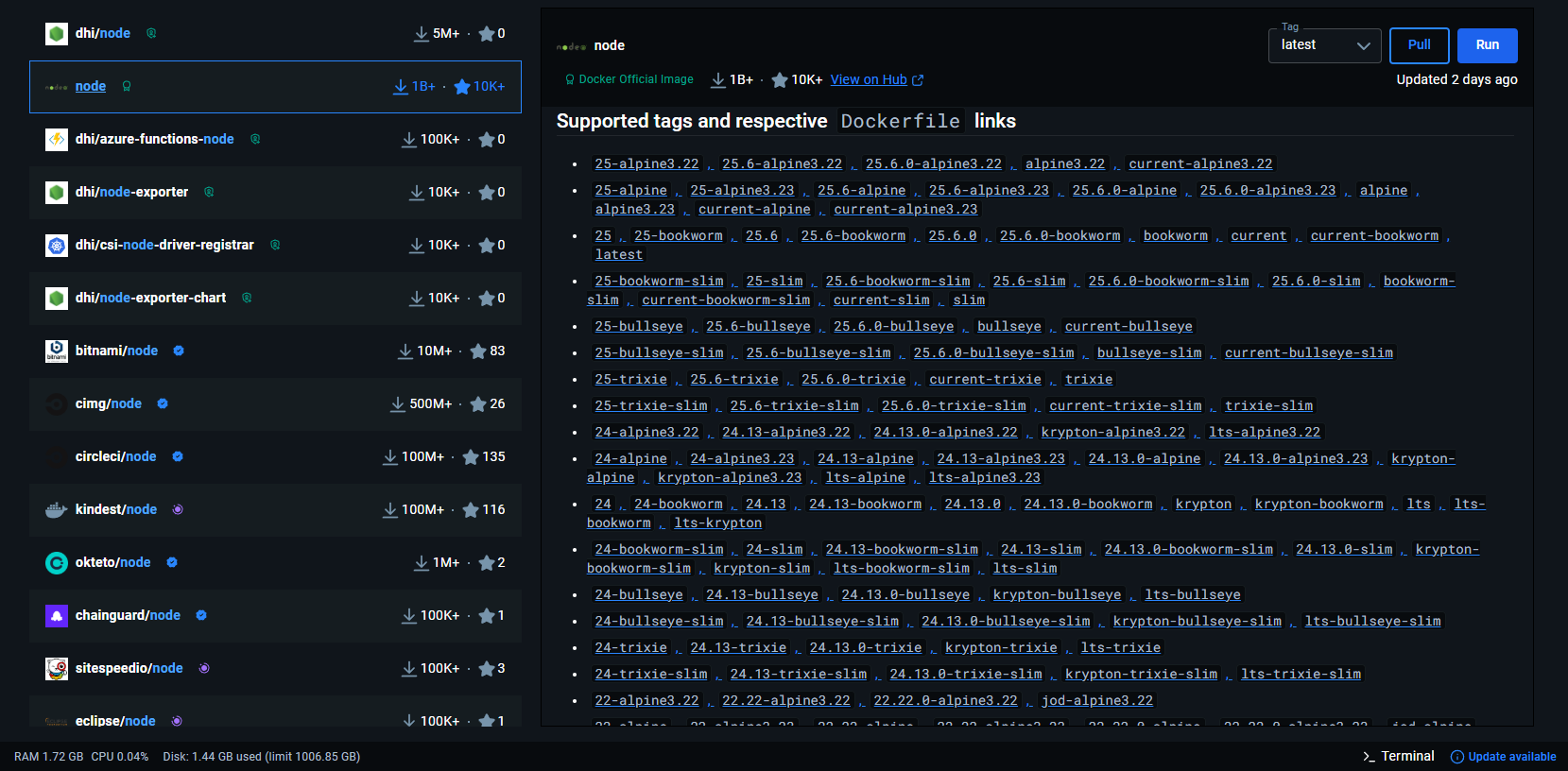 이는 각각 Node.js 20 버전이 Alpine Linux 혹은 Slim Linux 위에 설치된 이미지다.