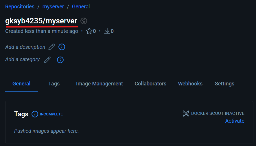 업로드가 끝난 뒤 Docker Hub 웹페이지를 새로고침하면 방금 올린 이미지가 Repository에 표시된다.