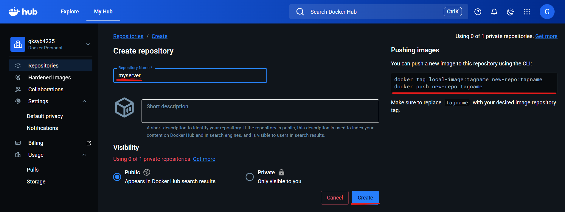 Docker Hub에 로그인하면 Repository를 만들 수 있다.