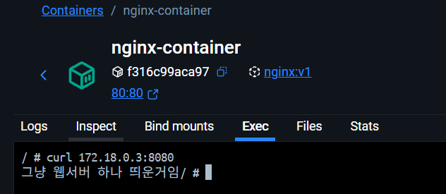 nginx 컨테이너 안으로 들어가서 웹서버 컨테이너에 직접 접속해본다.