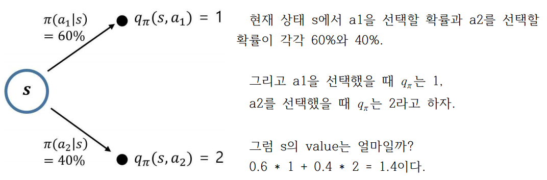 상태 s의 가치는 그 상태에서 선택 가능한 모든 행동의 가치의 평균이다.