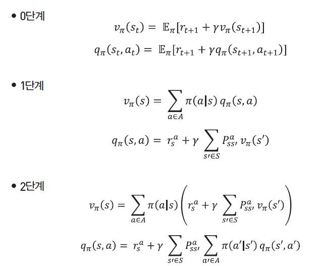벨만 기대방정식과 마찬가지로 2단계 수식은 1단계 수식 2개를 조합해서 만드는 수식이다.