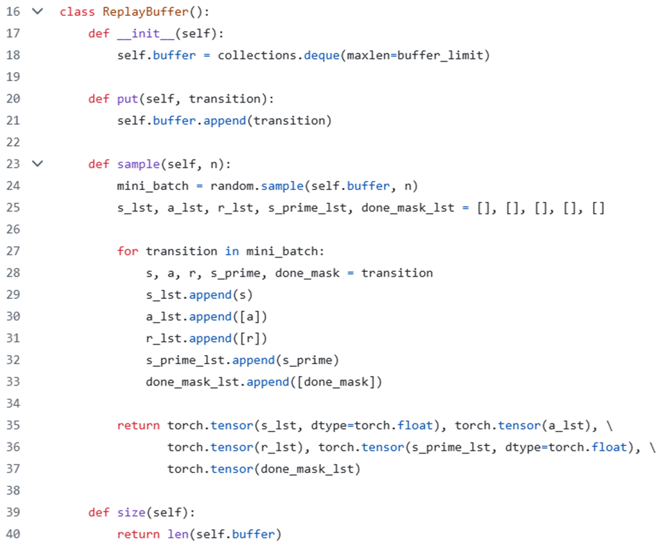 - sample(self, n) 하면 buffer 중 랜덤하게 n개를 골라 뽑아준다.
