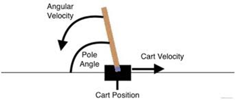 상태는 4차원 벡터(카트 위치/속도, 막대 각도/각속도)이며, 행동은 좌/우 두 가지다.