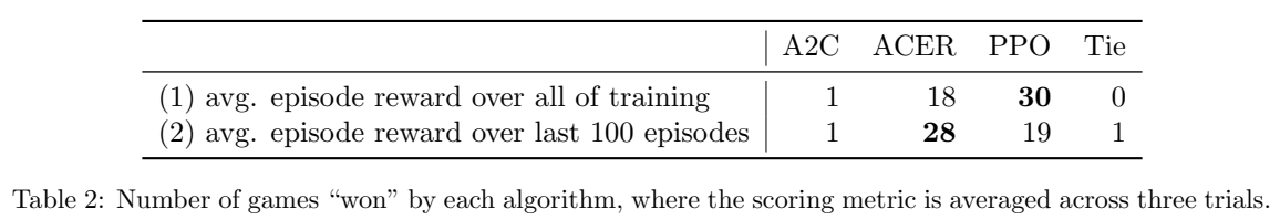 - 학습 속도 기준에서는 PPO가 49개 중 30개 환경에서 가장 좋은 성능을 보였다.