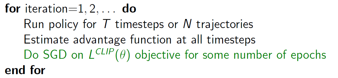 따라서 수집한 데이터를 이용해 L^CLIP(θ) objective를 기준으로 여러 번 SGD(Stochastic Gradient Descent)를 수행한다.