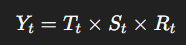 여기서 Yt란 시계열의 실제 값, Tt란 추세 (장기적인 증가 혹은 감소 경향), St는 계절성 (주기적 반복 패턴), Rt는 잔차 (추세와 계절성을 제외한 불규칙한 요인을 뜻한다.