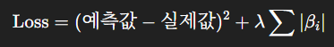 여기서 βi는 각 특성(feature)의 계수이고, λ는 얼마나 강하게 규제할지 정하는 파라미터이다.