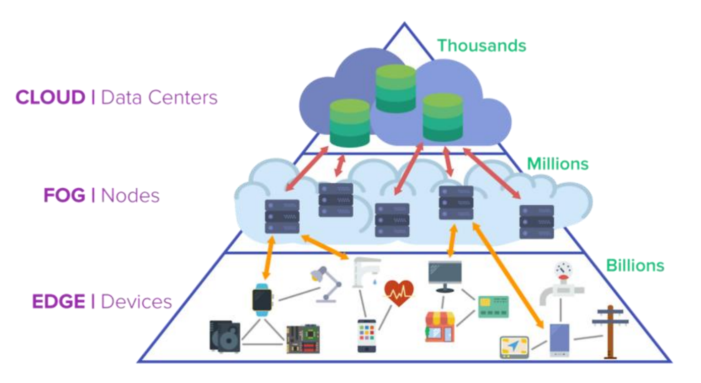 위 그림은 상단의 중앙 집중형 구조에서부터 사람이나 기계에 가까운 위치에 있는 분산형 장치들의 분포를 나타낸다.