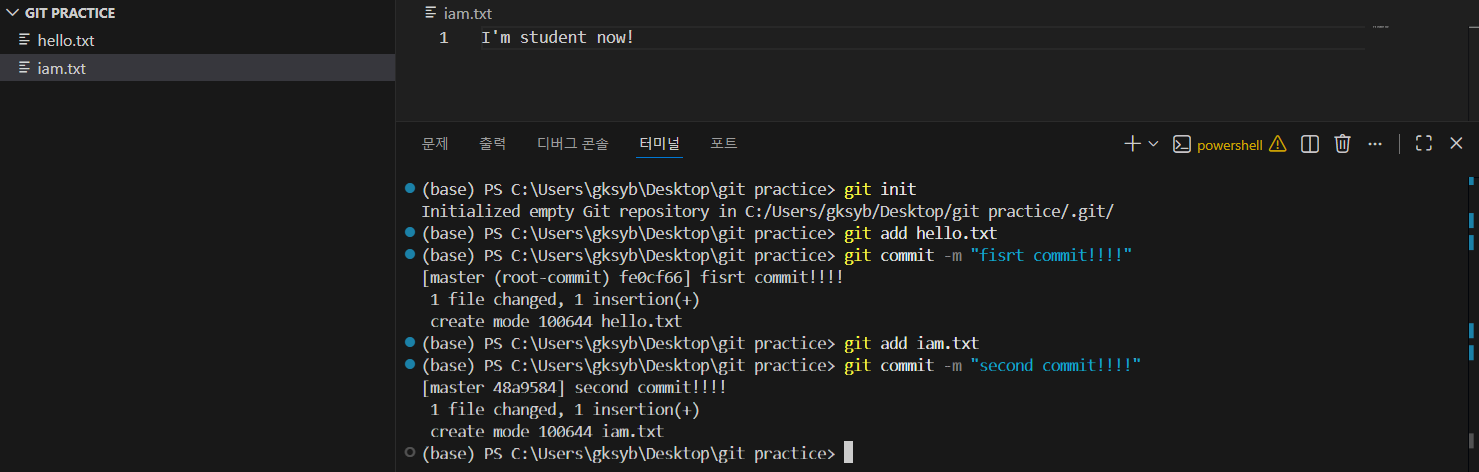 그 다음에 git commit -m '메시지' 라고 입력하면 된다.