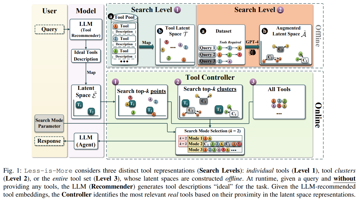 이 문제를 해결하기 위해 Less is More 연구팀은 LLM 기반 도구 추천기를 사용해 동적으로 도구를 선택하는 방법을 제안했다. LLM에게 “사용자 쿼리에 답하기 위해 필요하다고 ‘생각하는’ 도구의 수와 종류”를 추론하게 하고, 그 결과를 의미 기반 검색(다시 말해 도구 RAG)을 통해 최종 로드아웃으로 결정했다.
