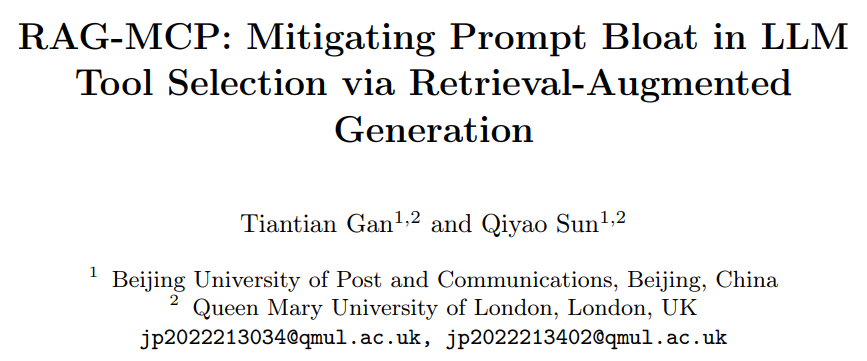 RAG-MCP 연구에서는 도구 설명을 벡터 데이터베이스에 저장하고, 입력 프롬프트에 따라 관련 도구만 선택하는 방식을 제안했다.